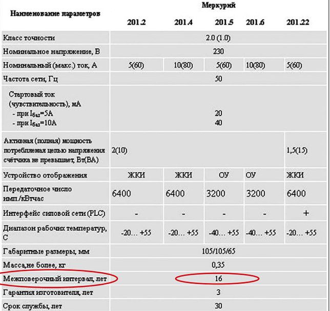 Межповерочный интервал электросчетчиков в таблице представлен в зависимости от марки оборудования: