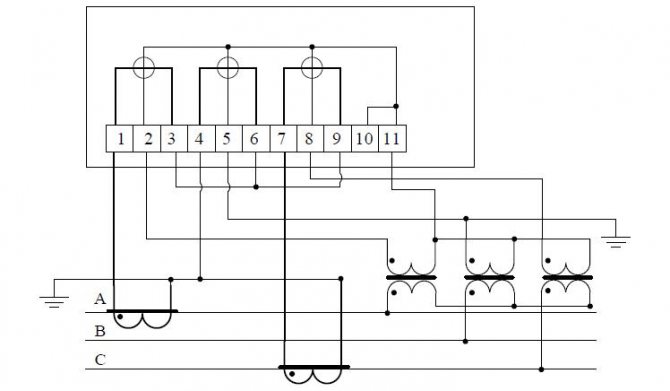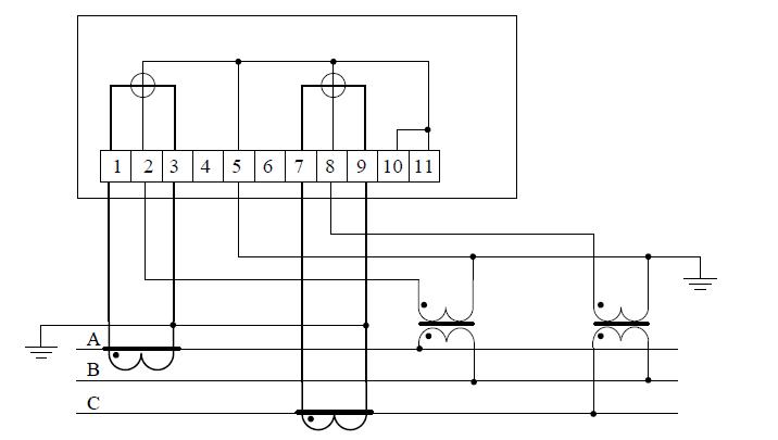 В этом случае используются не только высоковольтные трансформаторы тока, но и трансформаторы напряжения. Для трехфазного подключения необходимо заземлять общую точку трансформаторов тока и напряжения.