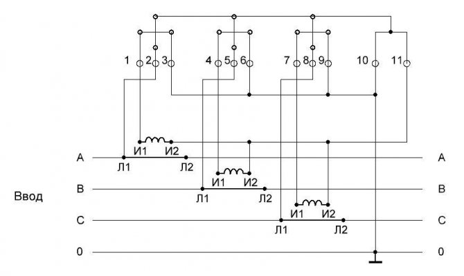 Как видно из рисунка, этот метод существенно отличается от прямого включения, когда счётный прибор подключается непосредственно в фазные линии.